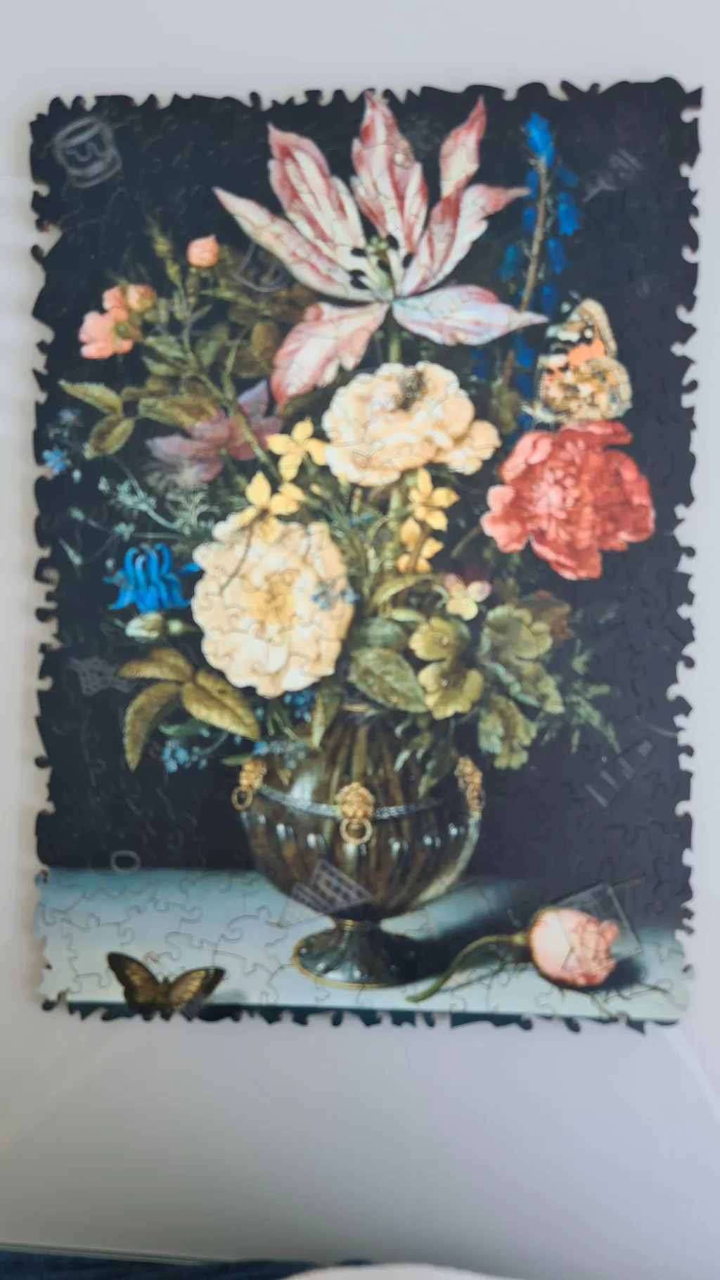 O quebra-cabeça da obra Ainda-vida com flores possui peças temáticas com formatos criativos incluindo peças detalhadas que retratam a própria obra, como flores e borboleta.