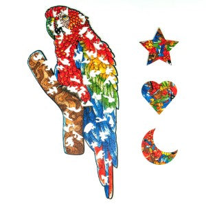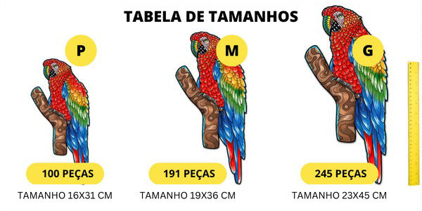Todas as suas peças possuem formatos diferenciados, oferecendo um quebra-cabeça diferente de tudo o que você já viu. Algumas das peças possuem formato de outros animais da fauna brasileira, e oferecem encaixes magníficos para deixar o desafio de montar o puzzle de madeira da arara muito mais emocionante.