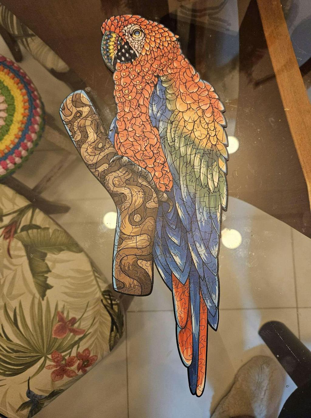 Cada detalhe da Arara-Vermelha foi pensado com cuidado. As cores, a arte e o corte das peças se encaixam em perfeita harmonia. Até as bordas seguem o formato da ilustração, deixando o quebra-cabeça com um visual diferente de tudo que você já viu. 🎨