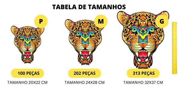Todas as suas peças possuem formatos diferenciados, oferecendo um quebra-cabeça diferente de tudo o que você já viu. Algumas das peças possuem formato de outros animais da fauna brasileira, e oferecem encaixes magníficos para deixar o desafio de montar o puzzle de madeira da onça-pintada muito mais emocionante.