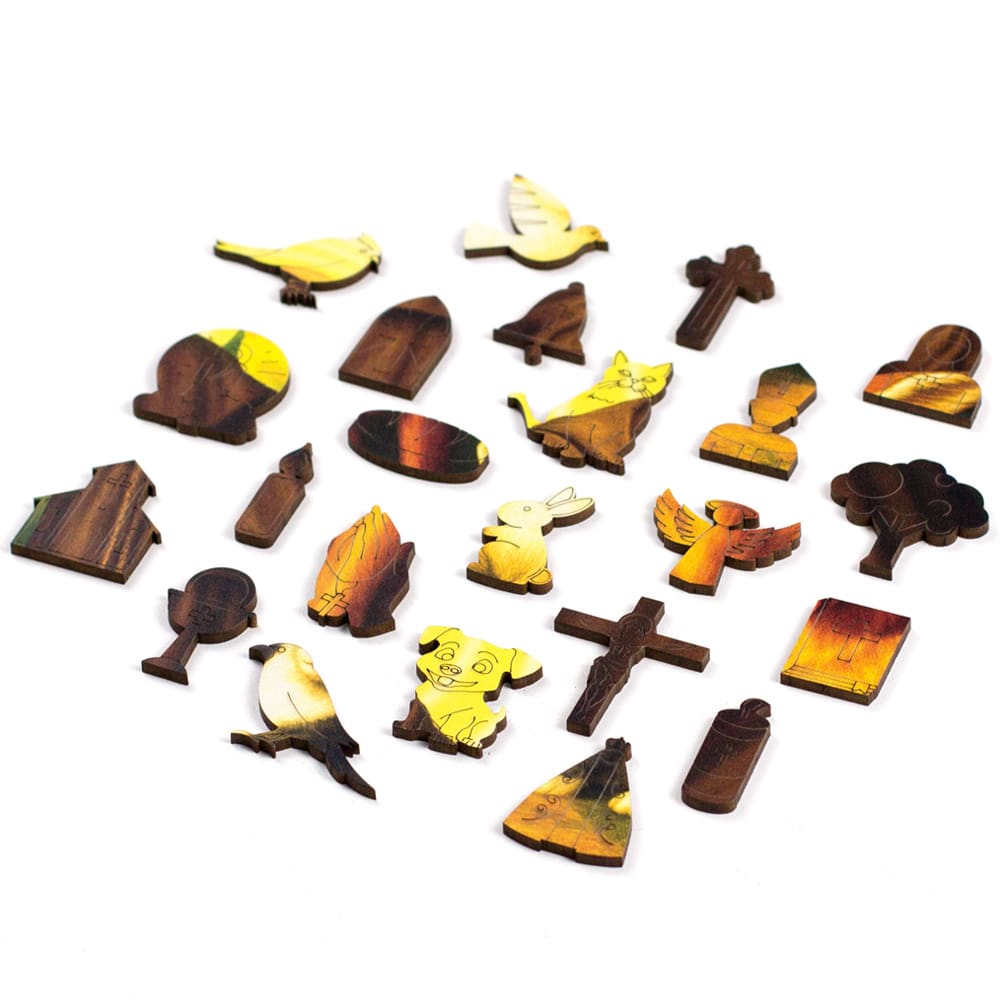 As peças ganham vida em formatos inspirados em símbolos cristãos e animais — como pássaro, cão, gato, cruz, Jesus, Nossa Senhora, entre outros. Esses elementos tornam a montagem emocionante, transformando cada encaixe em um gesto simbólico que conecta espiritualidade e natureza. 🐦