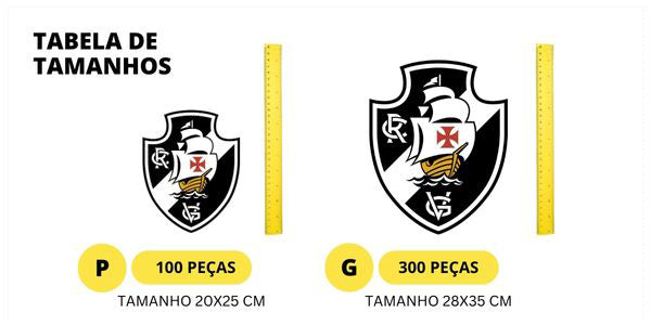O Quebra-Cabeça Vasco da Gama: Escudo Oficial está disponível em 2 tamanhos: P (100 peças e dimensões 20x25cm) e G (300 peças e dimensões 28x35cm). Ambos oferecem peças temáticas que foram trabalhadas e desenhadas para aumentar a imersão na hora da montagem. Alguns exemplos de peças com formatos especiais são: Estátua do Roberto Dinamite, Cruz da Malta, caravela, mascote Almirante, fachada de São Januário, camisa do vasco, letras que formam a escrita VASCO, jogadores, goleiro, bola, campo, CRVG, entre muitas outras.