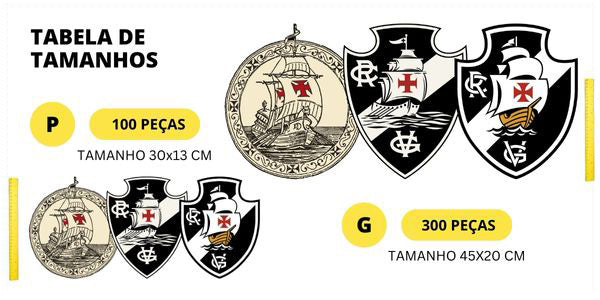 O Quebra-Cabeça Vasco da Gama: Evolução dos Escudos está disponível em 2 tamanhos: P (100 peças e dimensões 30x13cm) e G (300 peças e dimensões 45x20cm). Ambos oferecem peças temáticas que foram trabalhadas e desenhadas para aumentar a imersão na hora da montagem. Alguns exemplos de peças com formatos especiais são: Estátua do Roberto Dinamite, Cruz da Malta, caravela, mascote Almirante, fachada de São Januário, camisa do vasco, letras que formam a escrita VASCO, jogadores, goleiro, bola, campo, CRVG, entre muitas outras.